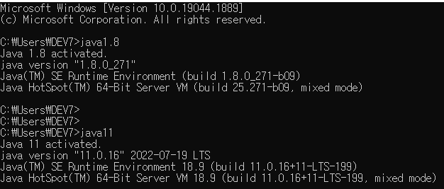 그리고 cmd 를 키고 java1.8 // java11을 입력한뒤 버전이 액티브 됬다는 말이 나오면 성공