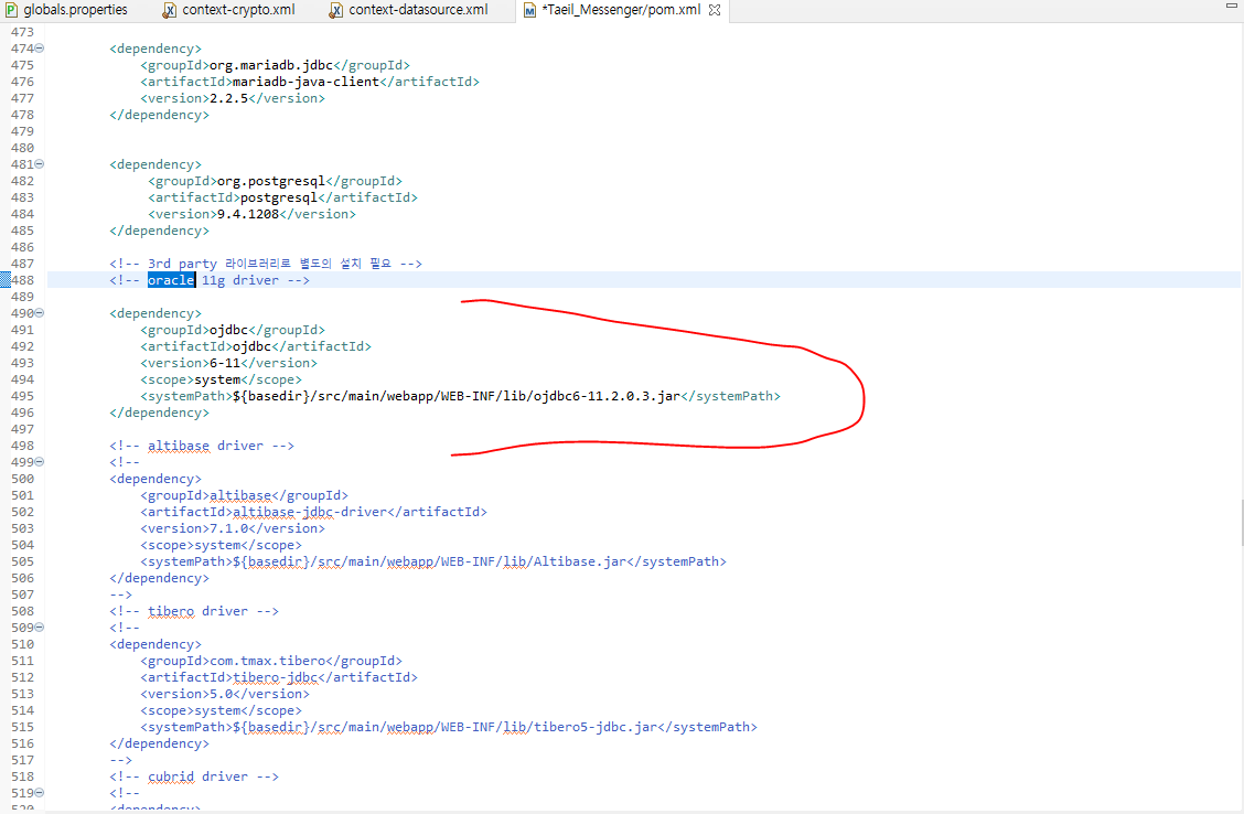 - 그리고 pom.xml 에서 아래 사진처럼 oracle 부분 주석을 제거해준뒤 maven update를 해준다