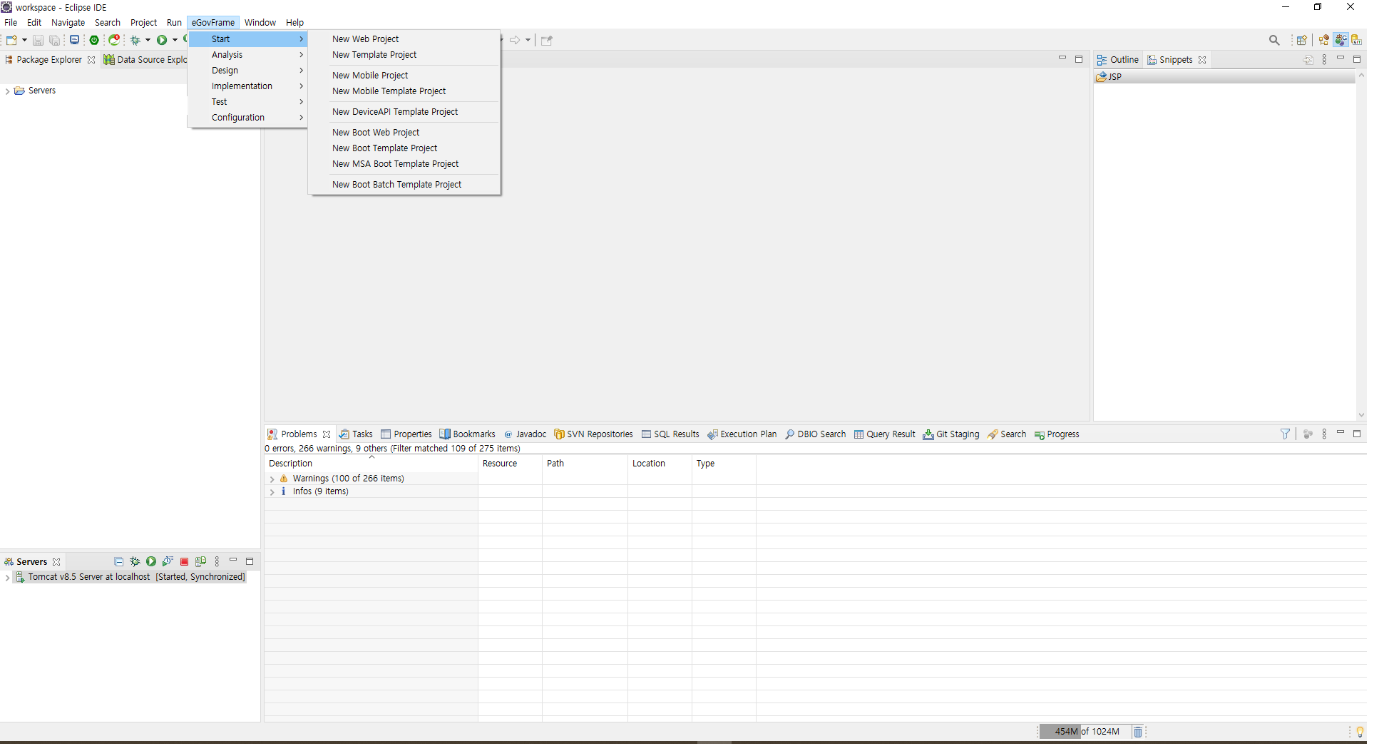 - eGovFrame 아이콘을 클릭한다면 맨 위 상단바 메뉴에 eGovFrame이 생긴것을 알 수 있다.