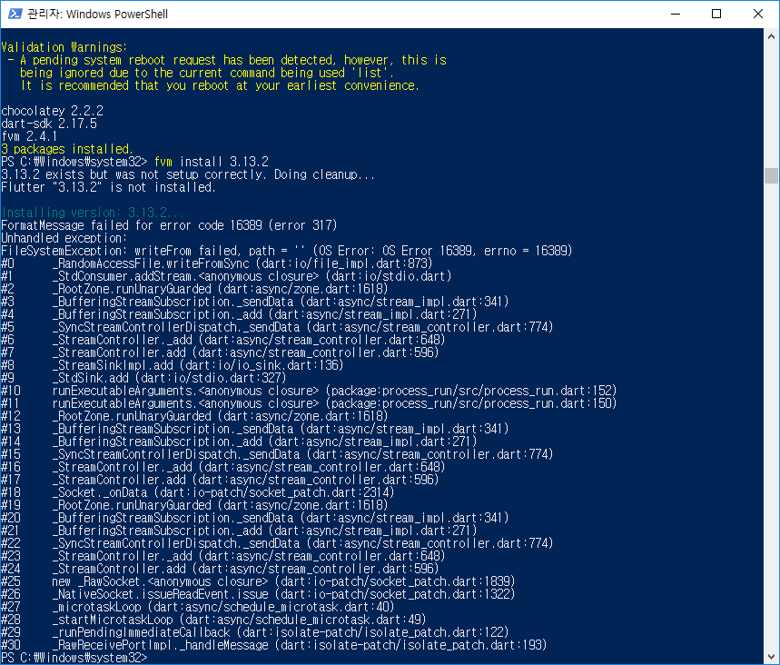 해당 에러였는데 fvm git에 문의까지했는데 알고보니 window업데이트문제였다