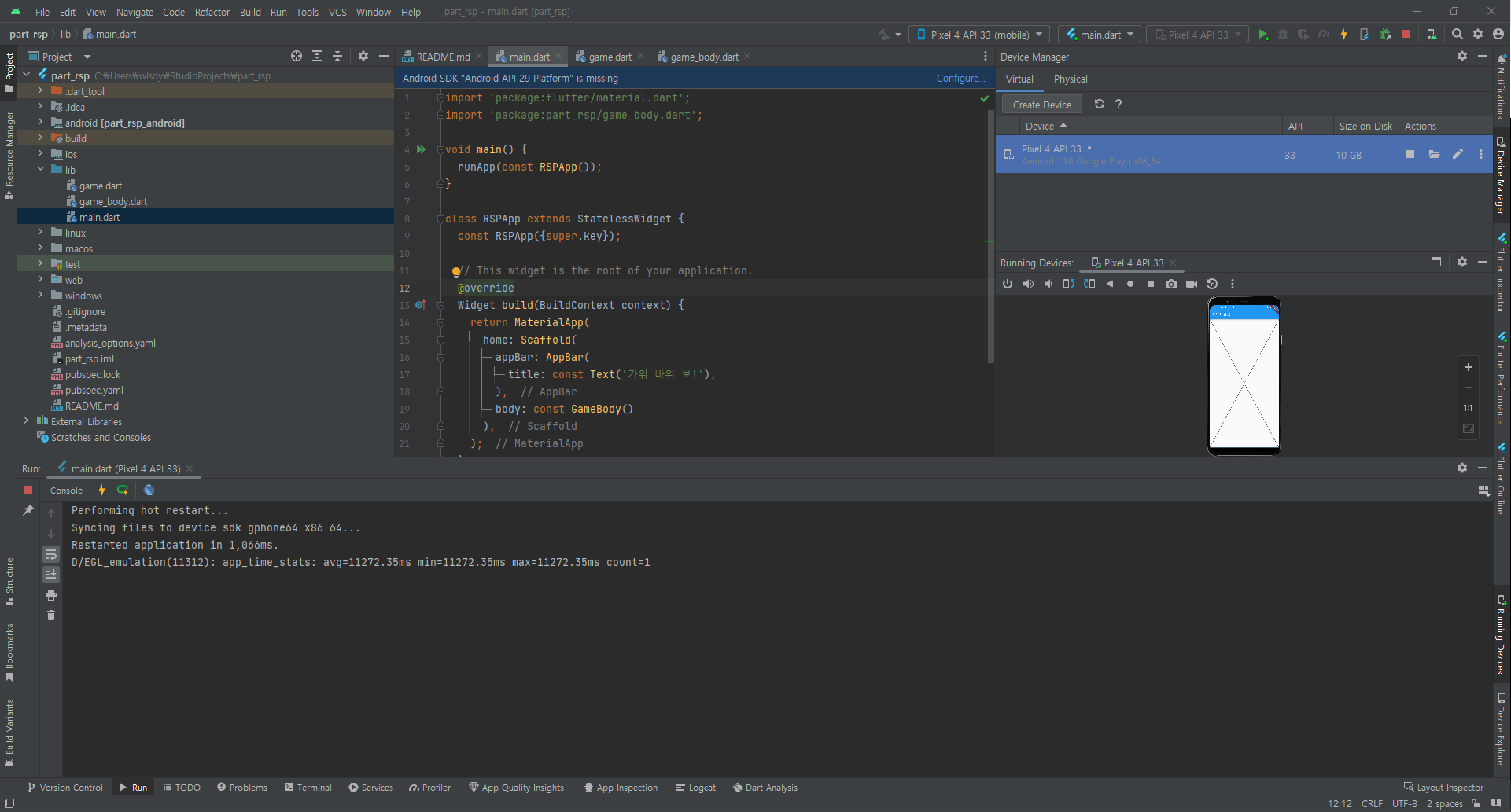 dart언어로만 했던 가위바위보도 device를 띄우고 flutter 프로젝트로 더 디테일 하게 다시 했는데 창이 계속 바뀌는걸 보면서 하니 더더 뿌듯한 맛이 있는거 같다