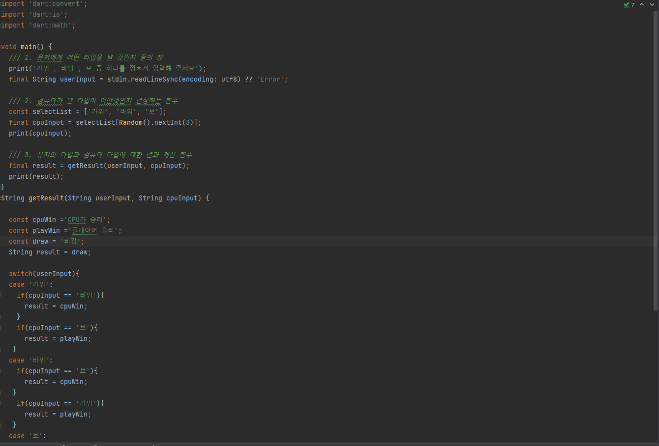 또 초반 강의중 dart에 대해 알아보는 시간이라 간단한 가위바위보 만드는 프로그래밍을 했었는데 반복문 , print문을 쓰면서 진짜 간단하다는 생각을 했다
